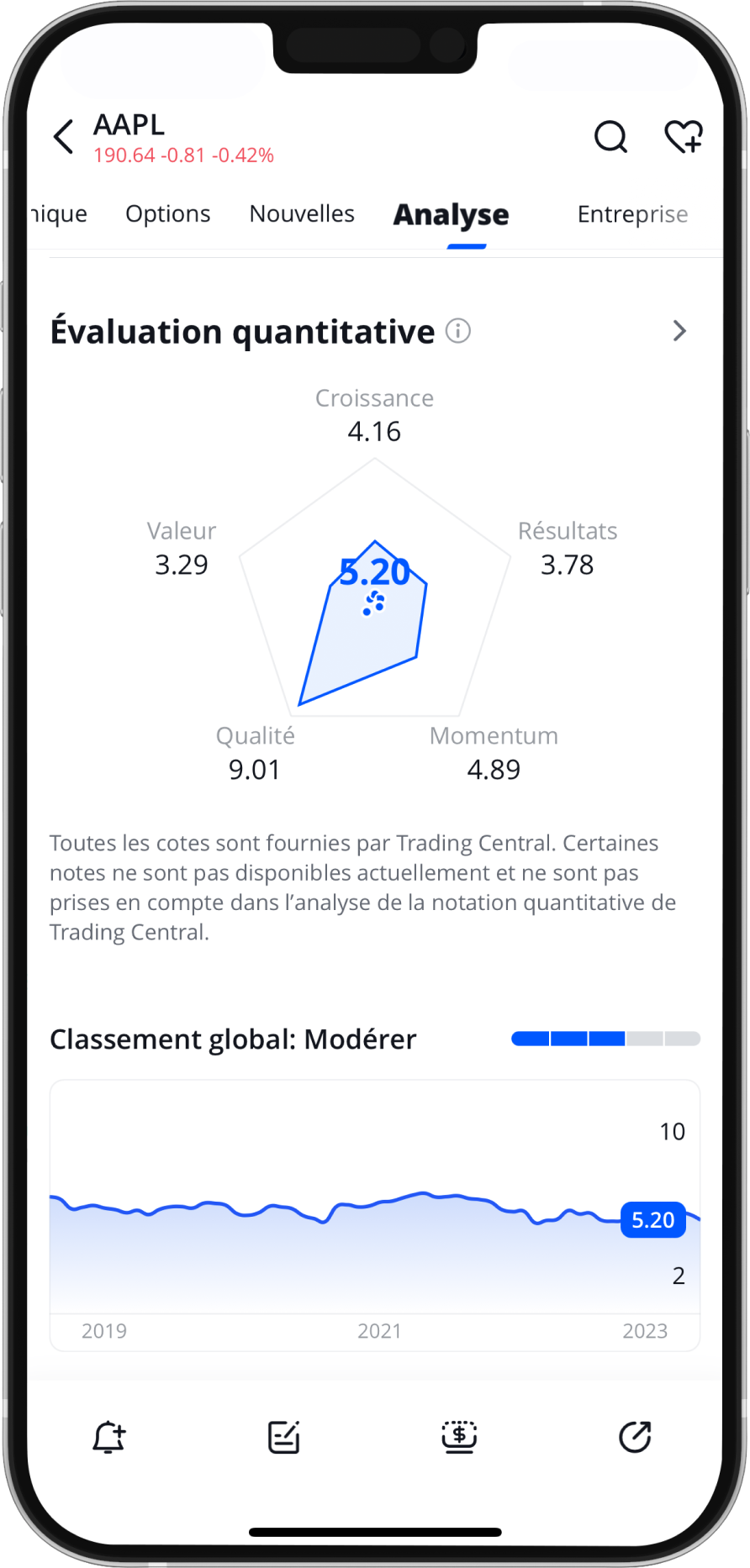 Pour développer une plus grande confiance dans vos idées de négociation, essayez de vérifier les méthodes que vous avez élaborées. Jetez un coup d’œil aux notes d’analyse technique et fondamentale des titres qui vous intéressent pour voir comment ils sont perçus d’un point de vue professionnel. Sur Webull, il y a une note quantitative sous l’onglet « Analyse » de chaque symbole.