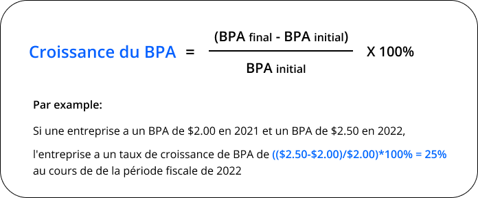 La croissance du BPA, qui illustre la croissance des bénéfices par action au fil du temps, permet d’identifier les actions dont la rentabilité augmente ou diminue. Les investisseurs peuvent comparer la croissance du BPA d’une entreprise à celle de son passé ou à celle de ses pairs dans le secteur.