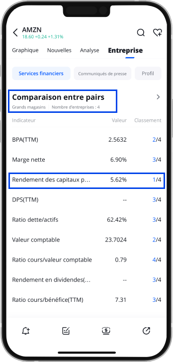 Choisissez un symbole et accédez à la page de détails. Cliquez sur Entreprise > Finances > Comparaison entre pairs pour vérifier le classement du RCP de l’entreprise.