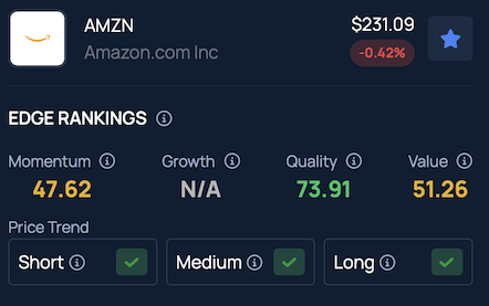 Le classement boursier Benzinga Edge montre que les actions Amazon suivent une tendance à la hausse à court, moyen et long terme. Cliquez ici pour en savoir plus sur le titre, ainsi que sur ses pairs et concurrents.