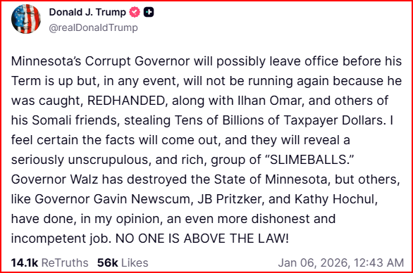 La décision de Walz de se retirer de la course à sa réélection intervient à un moment où le scandale des fraudes à l'aide sociale au Minnesota est un sujet brûlant, en particulier après que le YouTubeur de droite Nick Shirley a mis fin décembre à la fraude présumée en se rendant dans plusieurs garderies du Minnesota, principalement gérées par des immigrés somaliens. Sa vidéo sur YouTube a été visionnée des millions de fois. Le scandale est un problème récurrent, Walz étant critiqué pour sa gestion de la situation.