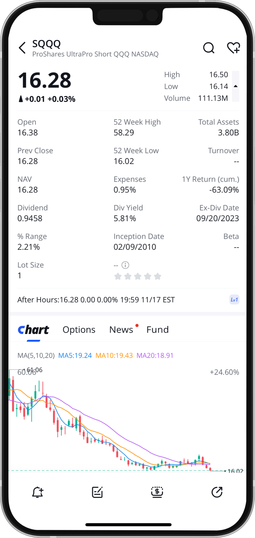You can click on the triangle icon in the upper right corner of the individual symbol details page to view the key data for this inverse ETF. ↓