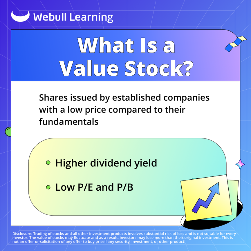 • Low P/E and P/B ratio. Value stocks are undervalued. Their prices are low compared to the earnings and book value, which means the market is unwilling to pay for their worth.