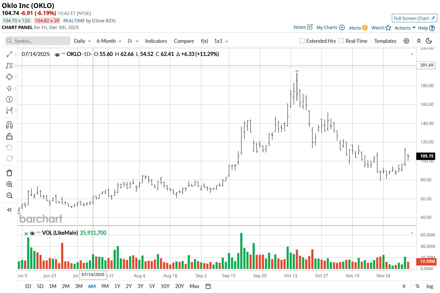 According to Barchart, options traders are also currently pricing in potential for a continued decline in OKLO shares to about $58 in the first half of next year.