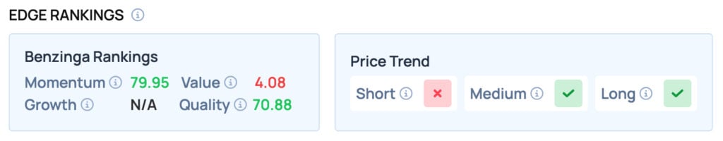 Tesla scores well on the Momentum and Quality metrics, but offers poor Value. It also has a favorable price trend in the Medium and Long term. For more such insights, sign up for Benzinga Edge Stock Rankings today!