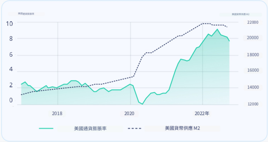 自2021年中期以來,美國經濟經歷了通脹飆升。儘管通脹飆升的原因一直是熱門爭論的話題,但人們認為造成這現象的因素有很多。Covid-19大流感創造了對消費必需品的巨大需求,同時使供應鏈陷入斷裂,導致價格急劇上漲並造成短缺。與此同時,美國貨幣政策制定者從 2020 年初開始大幅增加貨幣供應量。2022 年初,俄羅斯和烏克蘭之間爆發戰爭,對小麥和天然氣等大宗商品的全球市場造成了嚴重干擾 。勞動力市場的相對強勢從而推高了生產者價格,這最終也反映在通脹數據上。這些皆被認為是通脹飆升的因素。