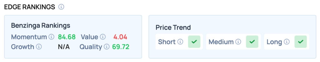 Tesla scores well on the Momentum and Quality metrics, but offers poor Value. It also has a favorable price trend in the Short, Medium, and Long term. For more such insights, sign up for Benzinga Edge Stock Rankings today!